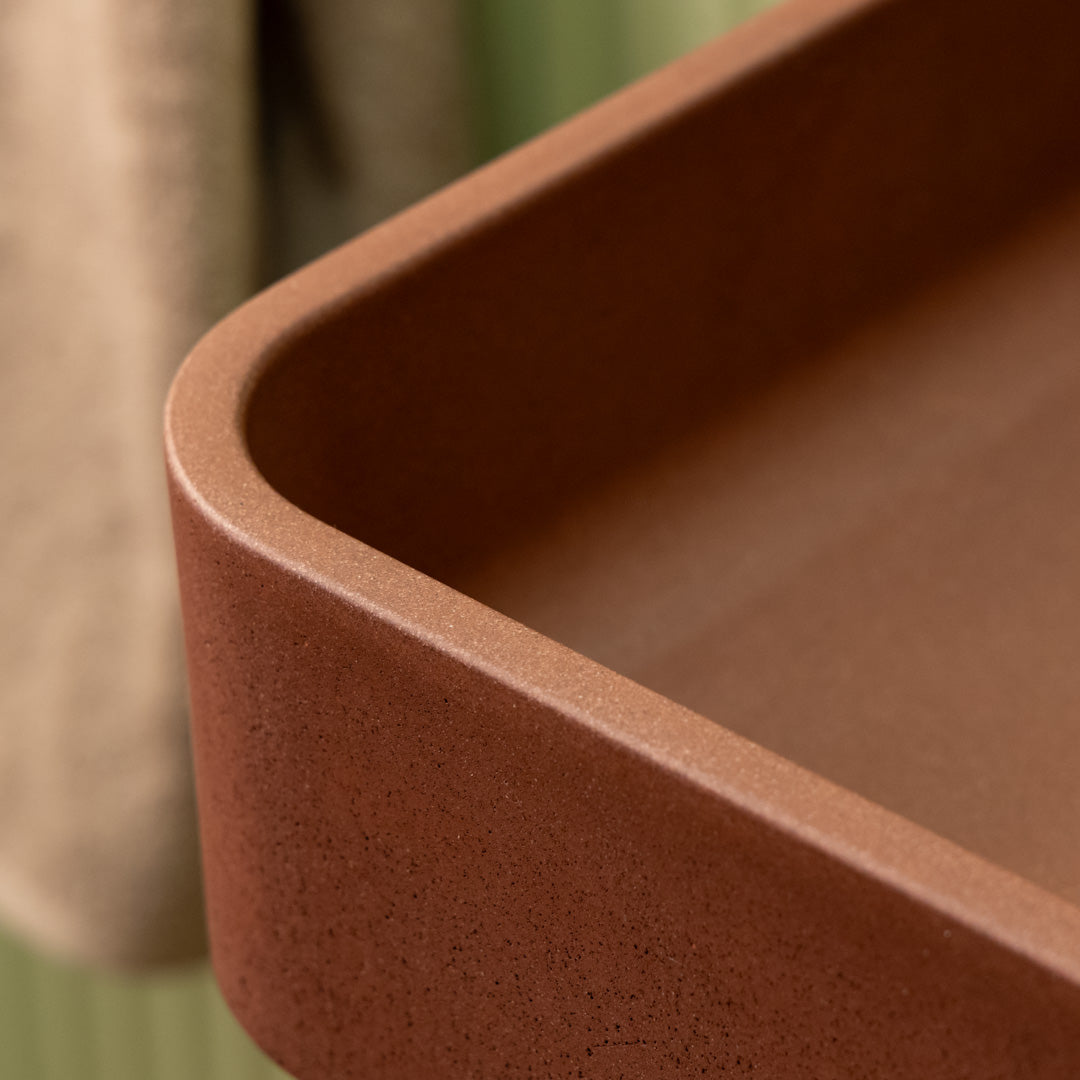 Rankomis pagamintas iš aukščiausios kokybės betono. Boxy Basin pasižymi švariu kvadrato formos dizainu, kuris šiuolaikiniams vonios kambariams suteikia struktūros ir pusiausvyros. Dėl lygios matinės apdailos ir aštrių linijų jis puikiai tinka šiuolaikiškam ar pramoniniam interjerui. Kiekviena kriauklė yra unikali, su subtiliais atspalvio ir tekstūros skirtumais, kurie išryškina jos rankų darbo pobūdį. Suprojektuota taip, kad ją būtų galima lengvai sumontuoti ant stalviršio, ji pasižymi ilgaamžiškumu ir santūriu stiliumi.